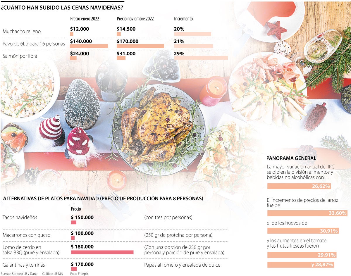 La cena de Navidad no queda exenta del alza casi que global. Las cenas premium por defecto más tradicionales en Colombia, según las empresas de catering, son: muchacho relleno de res y pavo. Estos dos platos han registrado un alza de casi 20% desde enero de este mismo año.