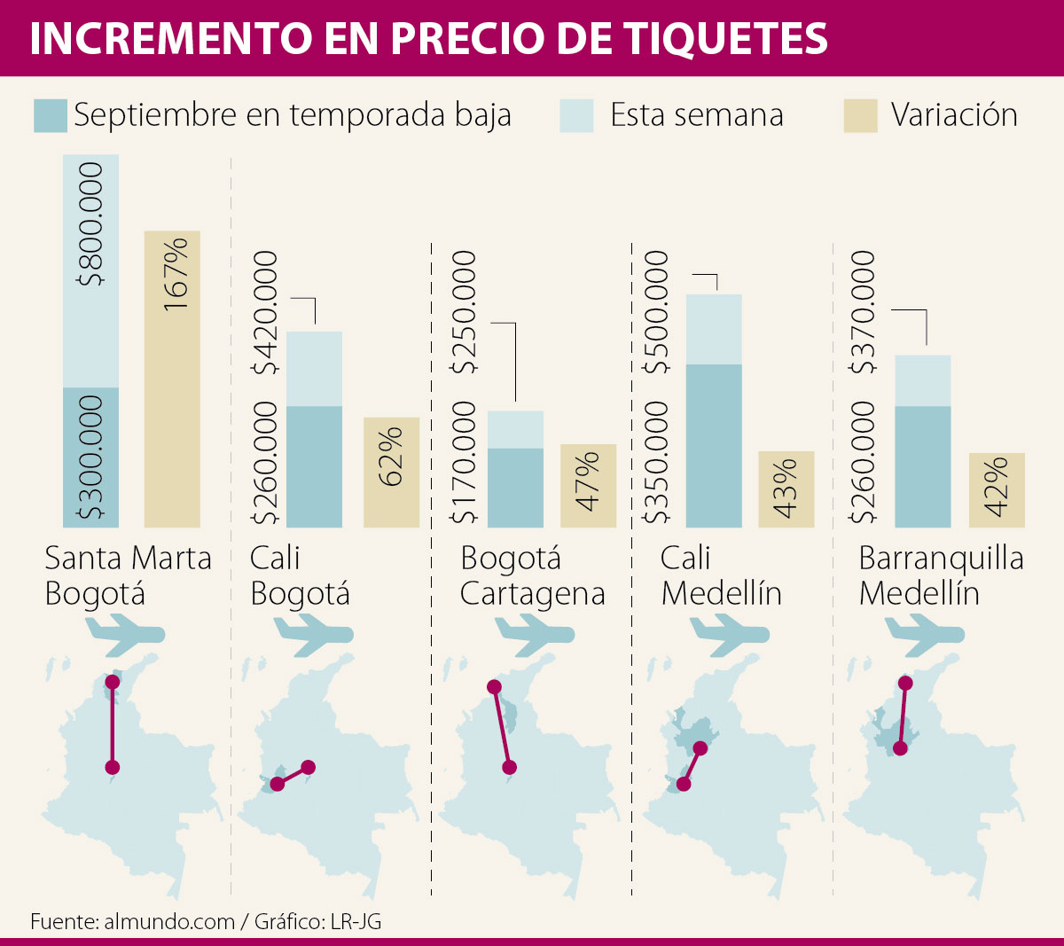 Las cifras indican que para viajar en septiembre, que es considerado un mes de temporada baja, este trayecto cuesta $170.000, mientras que ahora los tiquetes cuestan en promedio $250.000.