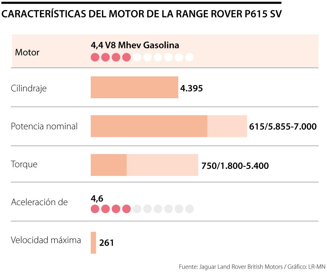Algunas de las características distintivas de la Range Rover SUV son el paquete SV signature Suite, el cual incluye una configuración de cuatro puestos, consola central fija, dos neveras, un sistema de entretenimiento con dos pantallas y mesa desplegable para trabajo; adicionalmente, también hay elementos distintivos en cerámica blanca en su interior y una combinación bi-tono de tapizado.