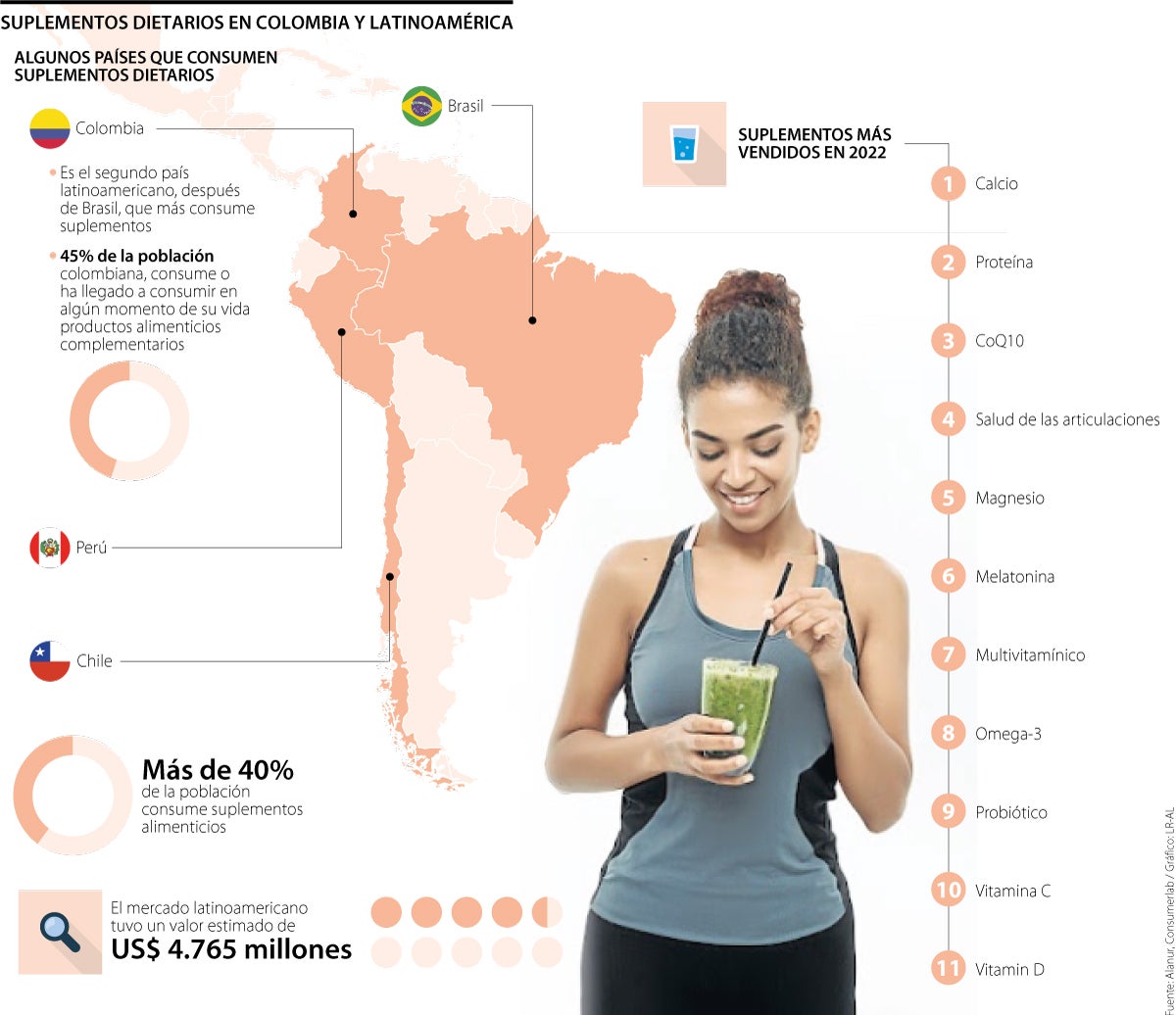 Estos han tomado fuerza en Latinoamérica, pues según la Alianza Latinoamericana de Nutrición Responsable (Alanur) esta región en 2021 representaba 7% del total del consumo de estos productos en todo el mundo. En Brasil, Perú, Colombia y Chile más de 40% de su población hace uso de estos productos. Según datos proporcionados por la Asociación Nacional de Industriales (Andi) y su Cámara de la Industria Farmacéutica, 45% de la población colombiana consume o ha llegado a consumir en algún momento de su vida productos alimenticios complementarios, además, el valor de la industria en América Latina estuvo cercano a los US$4.765 millones en 2020.