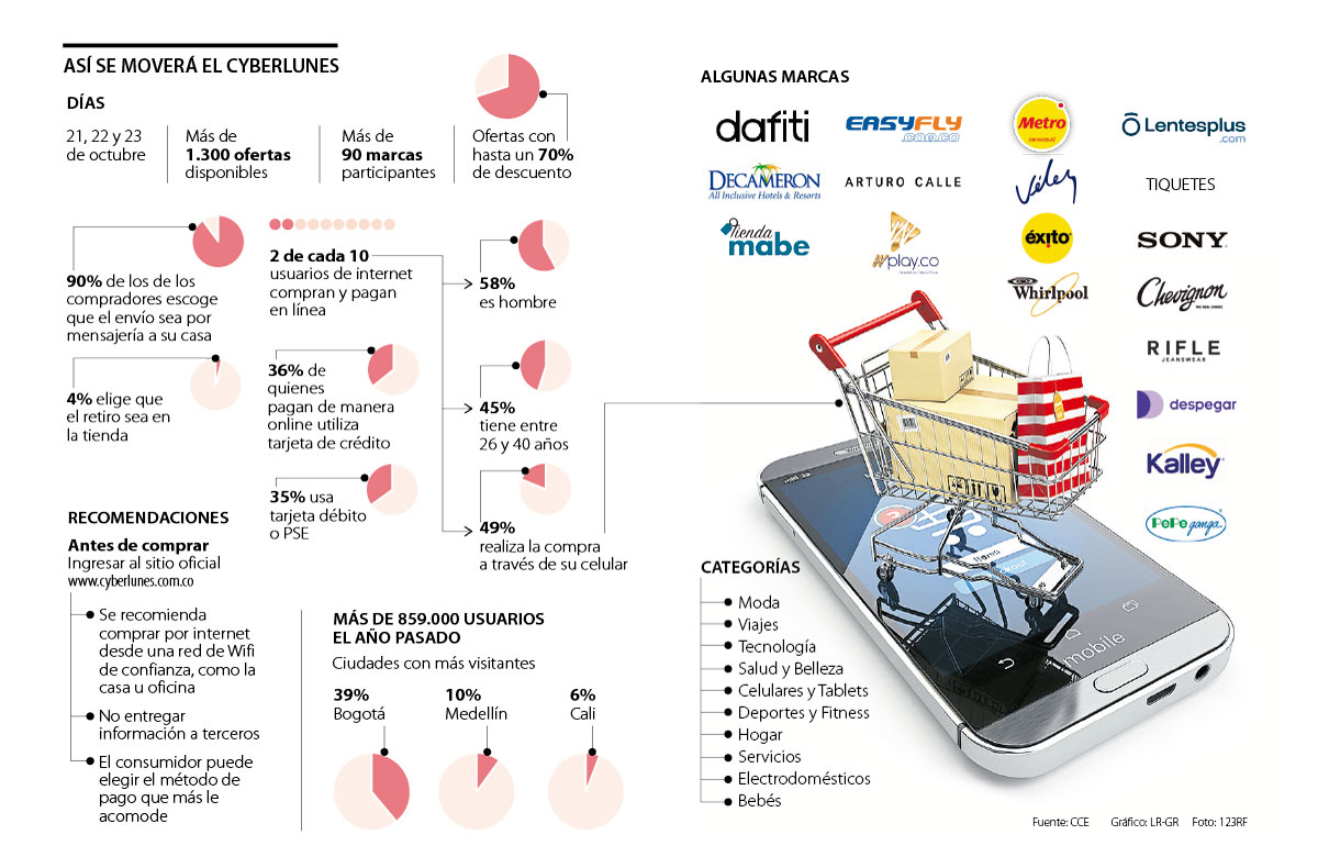 A partir de las 12 a.m. de hoy inició la 15° edición de Cyberlunes, organizada por la Cámara Colombiana de Comercio Electrónico (Ccce). Durante tres días (21,22 y 23 de octubre) los usuarios tendrán la posibilidad de adquirir productos y servicios con descuentos de hasta 70% en más de 10 categorías como tecnología, moda, viajes, salud y belleza, hogar y electrodomésticos.