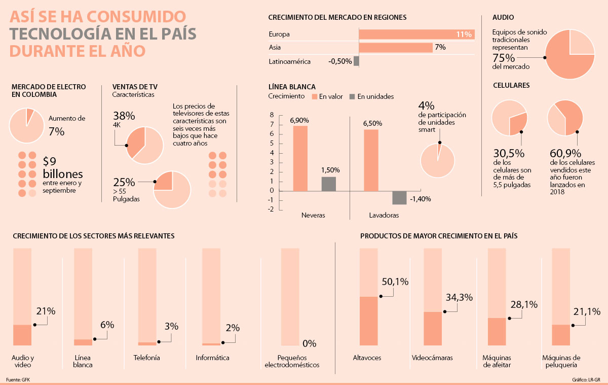 La investigadora GFK reveló un estudio sobre el comportamiento del consumidor colombiano en términos de tecnología de cara al cierre de este año, en el que se mostró que en los primeros nueve meses se han consumido $9 billones, lo cual representó un crecimiento de 7% frente a la estadística recogida el año pasado.