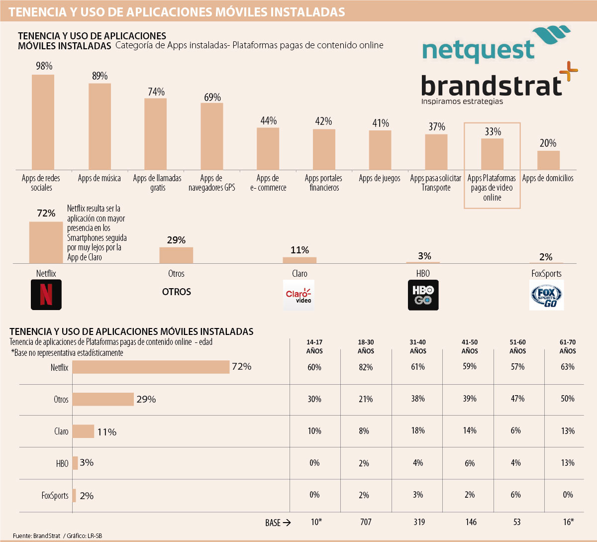 Según un análisis realizado por BrandStrat en alianza con Netquest se encontró que aunque las apps líderes son las de redes sociales con 98% de instalaciones, seguidas de las apps de música con 89%, las de video están ganando espacio y ya son descargadas por 33% de la población analizada.