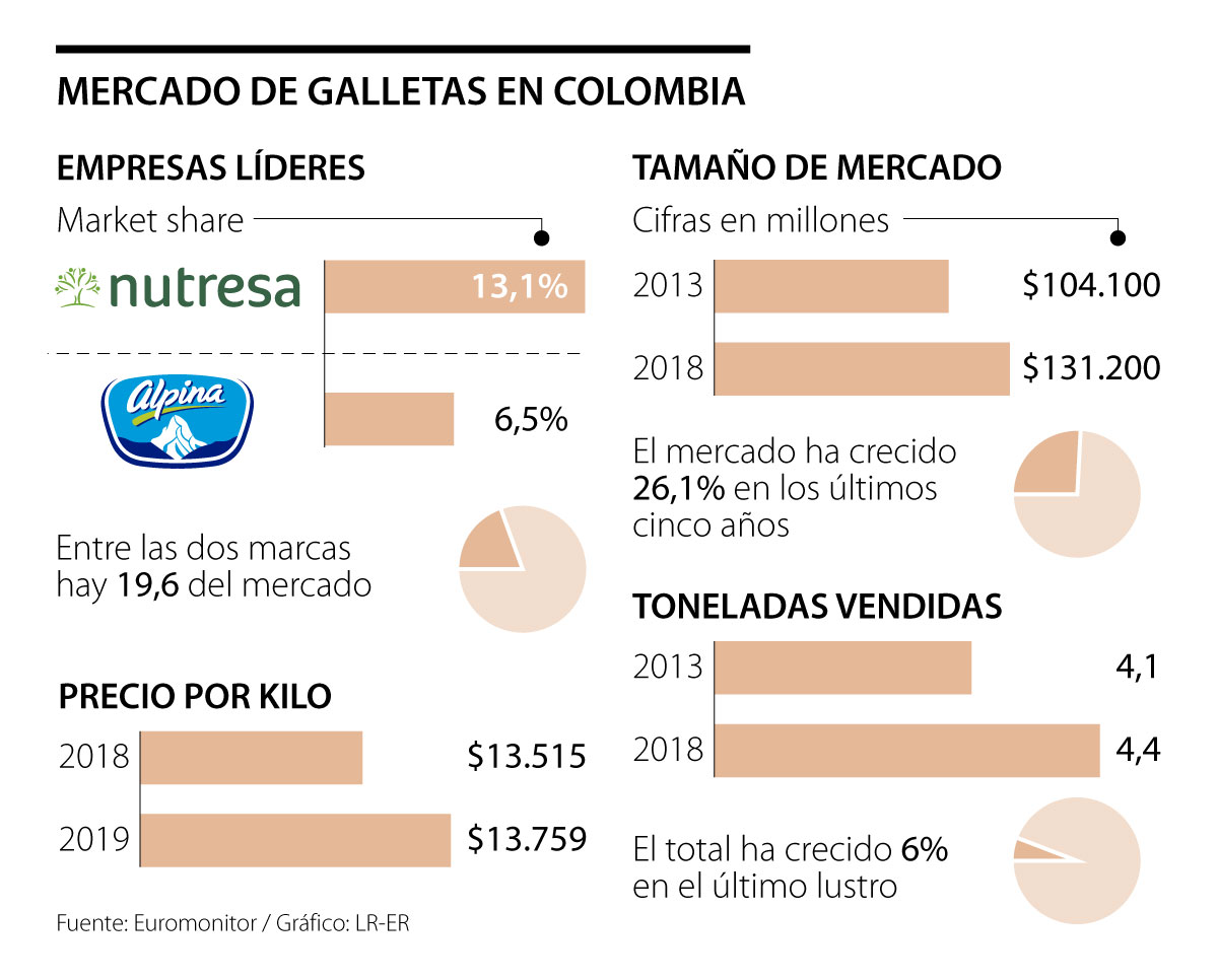 Para este año, los datos de Nielsen evidencian un crecimiento estable en el mercado, pues el valor de las ventas aumentó 1% entre 2018 y 2019. Hasta abril de este año, se han vendido $208.207 millones en galletas. Además, el precio por kilo también ha tenido aumentos de 1,8%, pues pasó de estar en $13.515 a $13.759 en lo que va corrido del año.