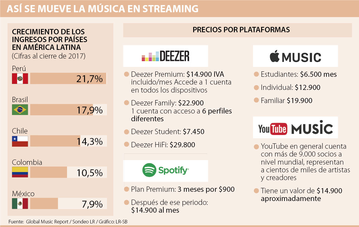 Actualmente, plataformas como Deezer tienen 53 millones de canciones y más de 20 millones de artistas. De acuerdo con Luis Gabriel Castillo gerente de Deezer en Colombia, hoy cuentan con diferentes planes: Deezer Premium, cuesta $14.900 IVA incluido/mes, Deezer Family, $22.900, Deezer Student, $7.450, Deezer HiFi, $29.800 y a la fecha tienen una oferta de tres meses de Deezer Premium por $1.000.