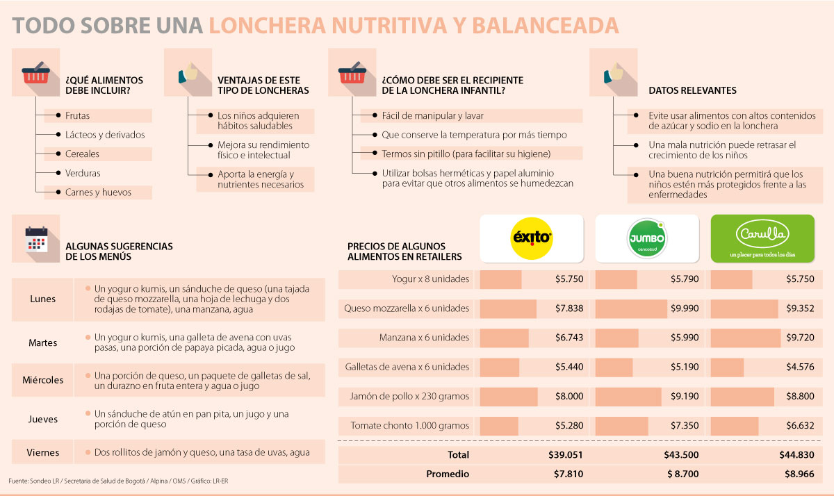 Los ingredientes que no pueden faltar en esta opción de lonchera balanceada y nutritiva, que revisamos en retailers son yogur, queso mozzarella, galletas de avena, manzana, jamón de pechuga de pollo y tomate chonto. Esta cesta tiene un precio total de $39.051, $43.500 y $44.830 en las cadenas mencionadas respectivamente, al sumar los valores que tienen estos alimentos podrían ser más económicos en una plaza de mercado.