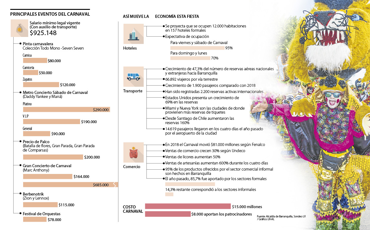 Es decir que si usted destina un salario mínimo a disfrutar el Carnaval puede comprar la “pinta carnavalera” ($200.000), ir al palco para los tres días de desfiles ($200.000), boleta para ver a Marc Anthony el viernes ($164.000), a Daddy Yankee el sábado ($90.000), también alcanza para ir a la Berbetronik el domingo ($115.000) y disfrutar del Festival de Orquestas el lunes ($78.000). Esto cuesta en total $847.000, es decir, sobran $78.000. Este monto lo puede destinar al transporte, pues una carrera mínima de taxi cuesta $6.000 o para cerveza cuyo precio promedio es de $2.500.