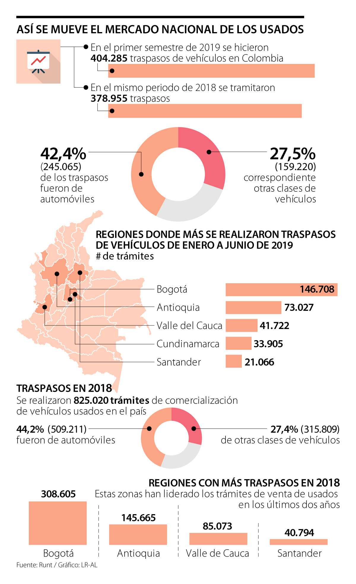 El balance semestral de la Concesión Runt, administradora del Registro Único Nacional de Tránsito, reveló que en el primer semestre de 2019 se hicieron 404.285 traspasos de vehículos en Colombia, esto es 9% más que en el mismo período del año pasado. Las unidades con más traspasos registrados en el Runt son los automóviles con 42% (245.065) de estos trámites.
