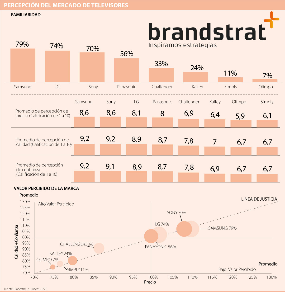 La segunda marca con mayor familiaridad fue LG, con 74%, y el tercer puesto fue para Sony, con 70% de familiaridad. Con 56% se ubicó Panasonic, y solo la tercera parte de los encuestados o menos, reconoció a Challenger, Kalley, Simply y Olimpo.