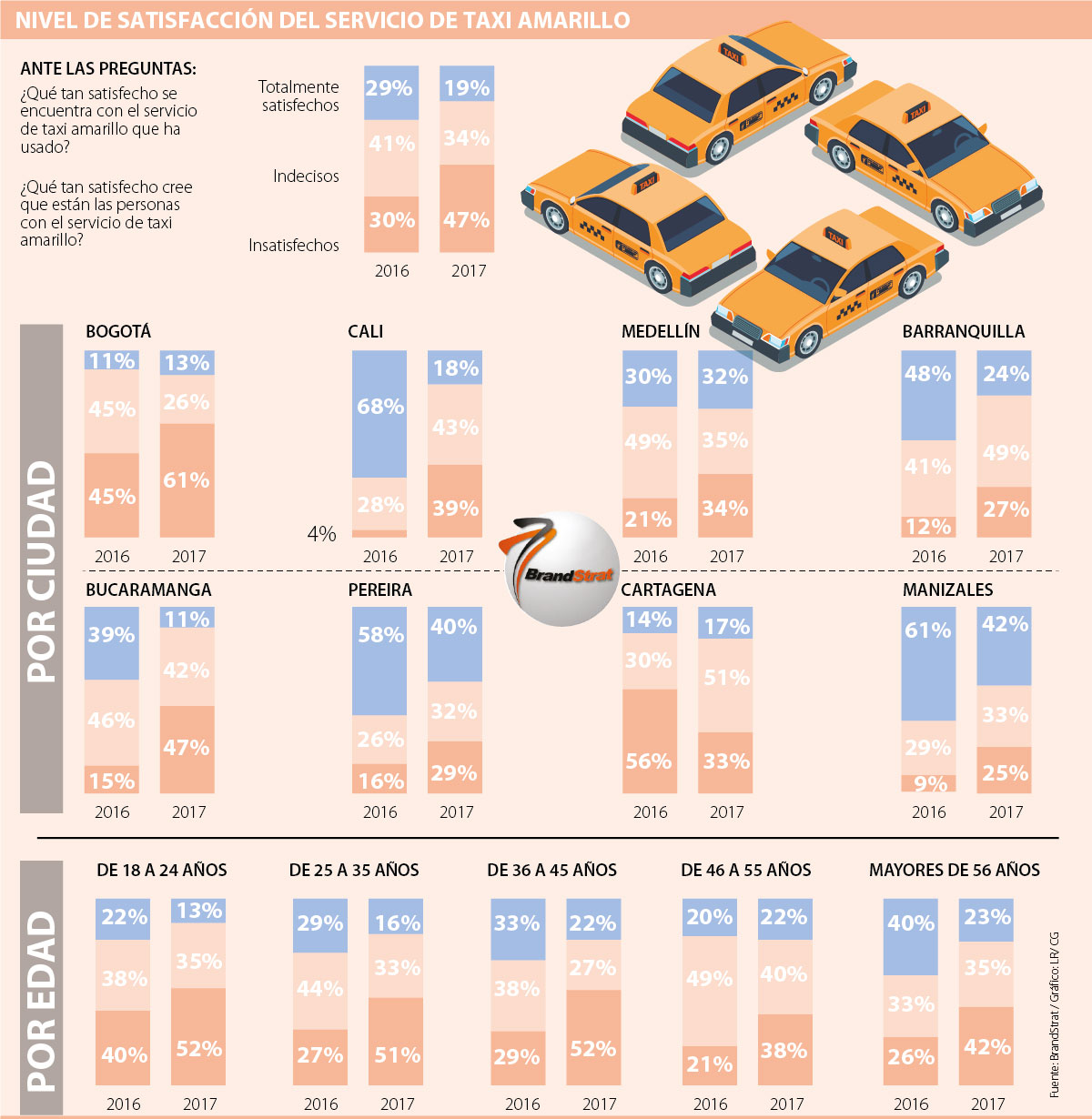 El auge de aplicaciones de celulares de servicio de transporte individual es un reflejo del descontento que sienten los colombianos a la hora de usar un taxi. Para confirmar esta teoría, la firma de investigación BrandStrat realizó un estudio con más de 1.000 personas en ocho ciudades principales del país basado en las siguientes preguntas clave: ¿qué tan satisfecho se encuentra con el servicio de taxi amarillo que ha usado? ¿qué tan satisfecho cree que están las personas con el servicio de taxi amarillo?