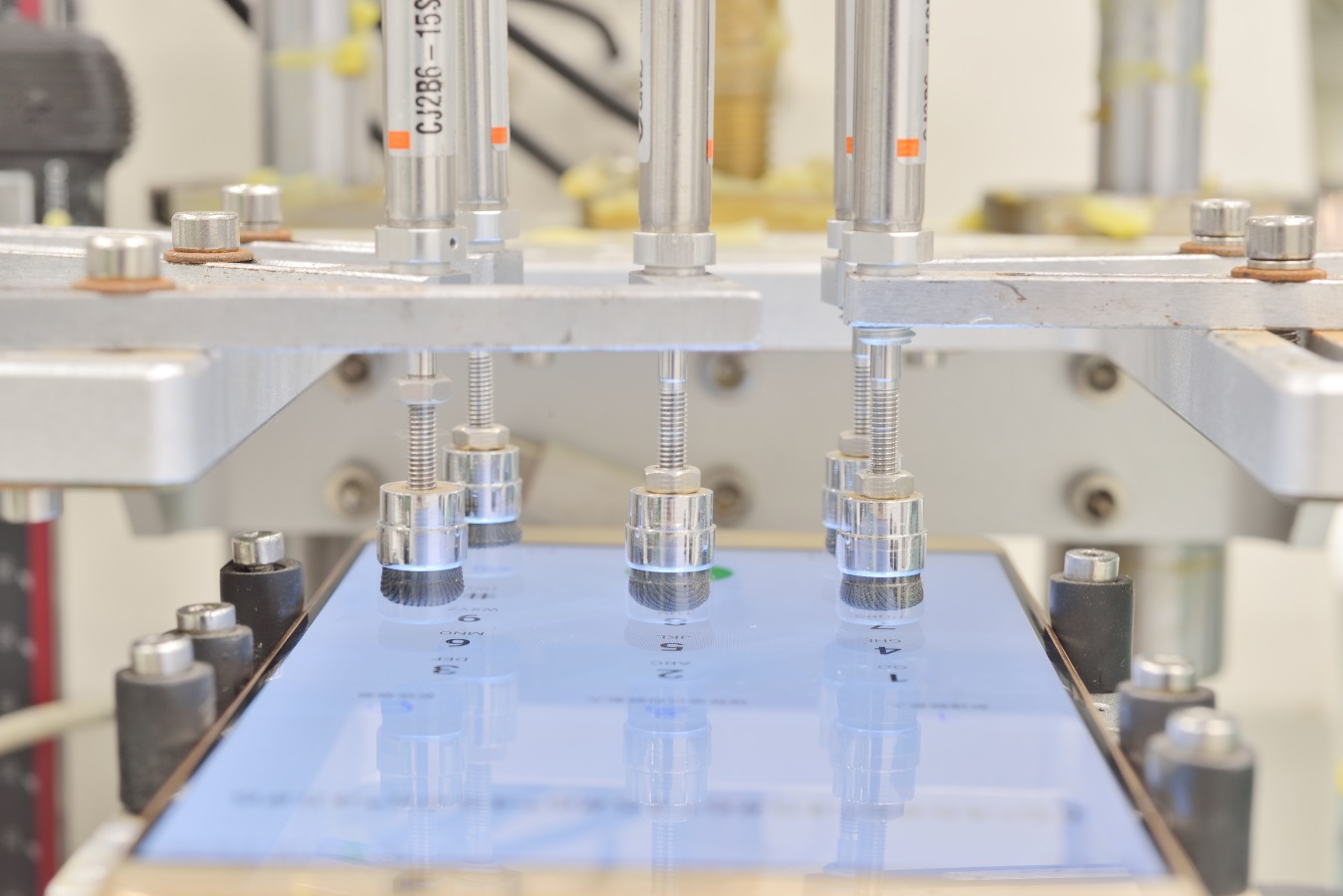 Otras de las pruebas que se hacen (ver imágenes) es presionar la pantalla del celular y para esto un equipo oprimir los botones más de un millón de veces.
