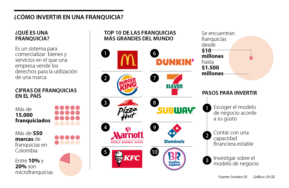 Pese a que McDonald’s, Burger King, Pizza Hut, Marriott y KFC son las cinco franquicias más vendidas en el mundo, en Colombia la situación es distinta. De acuerdo con Franquicias Colombia, para este 2019 Kumon, Subway, Alitas Colombianas y Kids Brain hacen parte de los negocios con un alto potencial de inversión. No obstante, estos superan el concepto de Microfranquicias las cuales se pueden encontrar en el mercado desde $10 millones a los $80 millones.