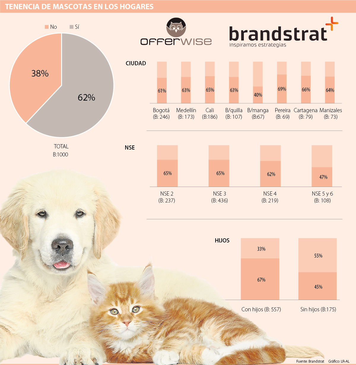 Seis de cada 10 hogares en el país tienen una mascota. A esa conclusión llegó la empresa de investigación de mercados y consultoría en estrategia BrandStrat, luego de realizar una investigación en alianza con Offerwise, un panel experto de consumidores que tiene presencia en más de 21 países de América Latina.