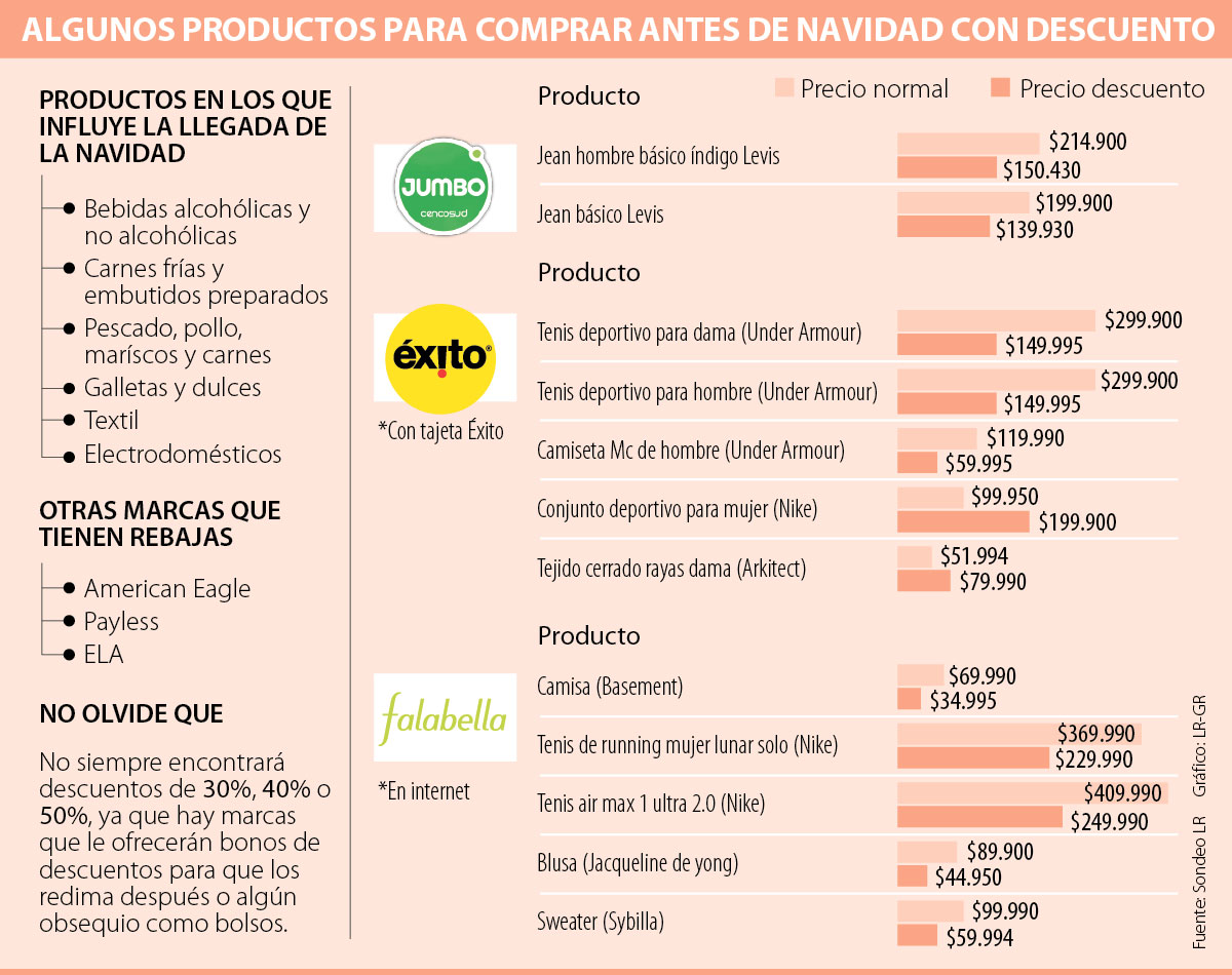 A esto se suman marcas como ELA, con descuentos en su página web, Payless y American Eagle. Esta última marca tendrá rebajas en diferentes tiendas en lo que queda de este mes. “En este momento tenemos 25% en tejidos, blusas, camisas y camisetas”, aseguró María Mercedes Jaramillo, directora de mercadeo de American Eagle, quien además dijo que la otra semana tendrán rebajas en prendas interiores y están programando varias estrategias antes de que llegue el 24 de diciembre.