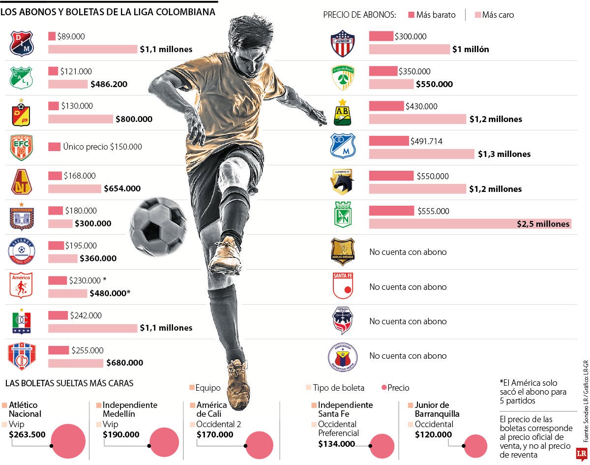 Entre los abonos más costosos se encuentran el de Atlético Nacional, con un valor de $2,5 millones, Millonarios FC con $1,3 millones, Bucaramanga y Llaneros con $1,2 millones. Cabe aclarar que estos abonos corresponden a zonas exclusivas en el estadio de cada equipo, las cuales generalmente son en la tribuna occidental.