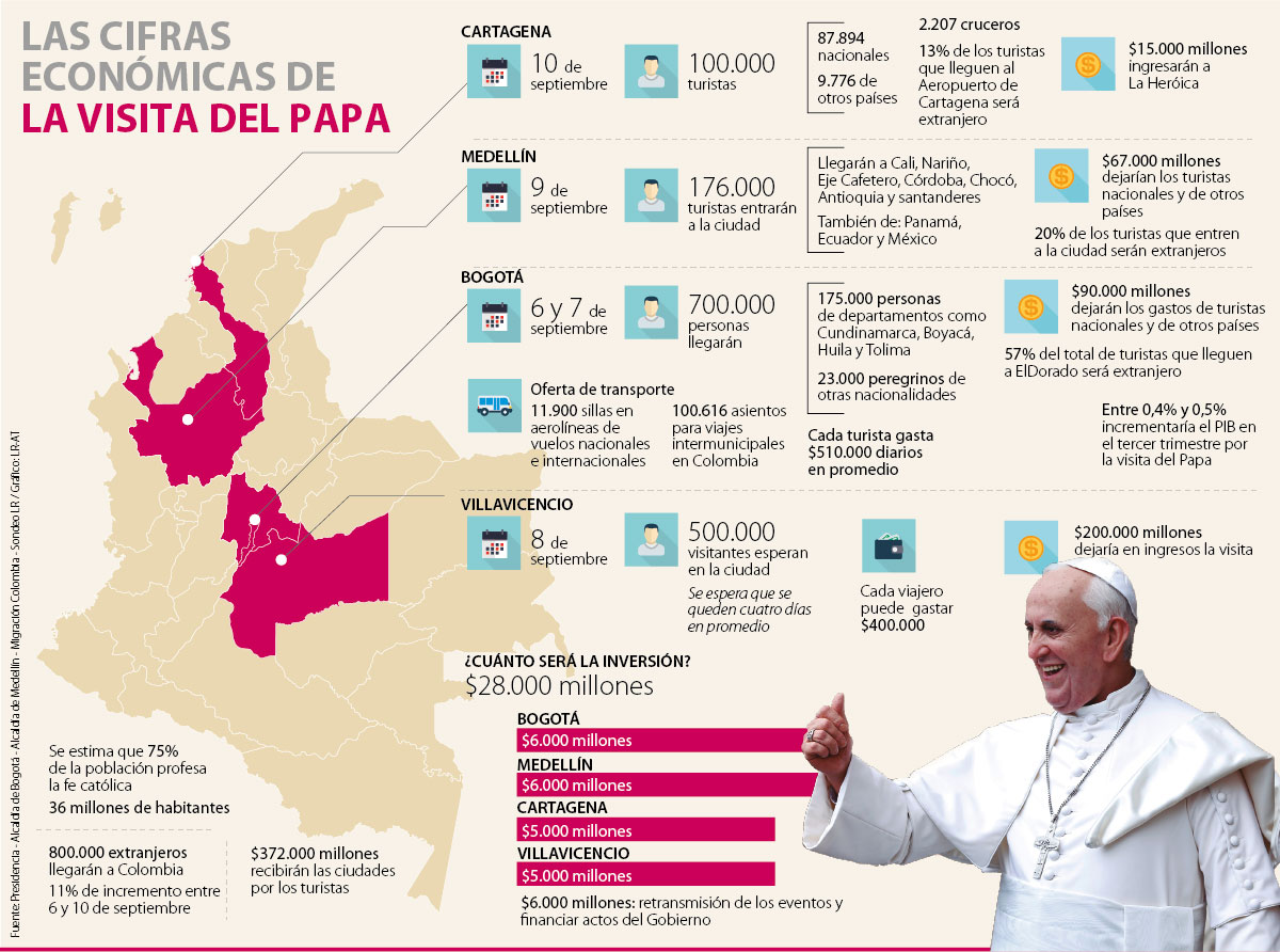 En Villavicencio, que será la segunda parada del Sumo Pontífice (8 de septiembre), se espera la llegada de 500.000 personas, las cuales visitarán la capital del Meta por cuatro días e invertirán $400.000 cada una, según Presidencia. Esto quiere decir $200.000 millones ingresarán a la ciudad.