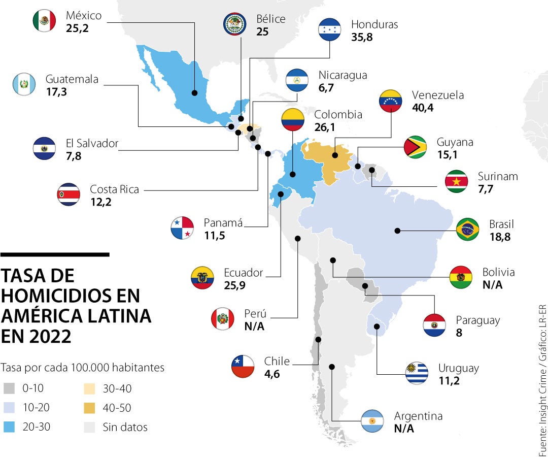 Un reporte regional de Insight Crime contabilizó la tasa de Colombia al cierre del año pasado en 26,1 por cada 100.000 habitantes