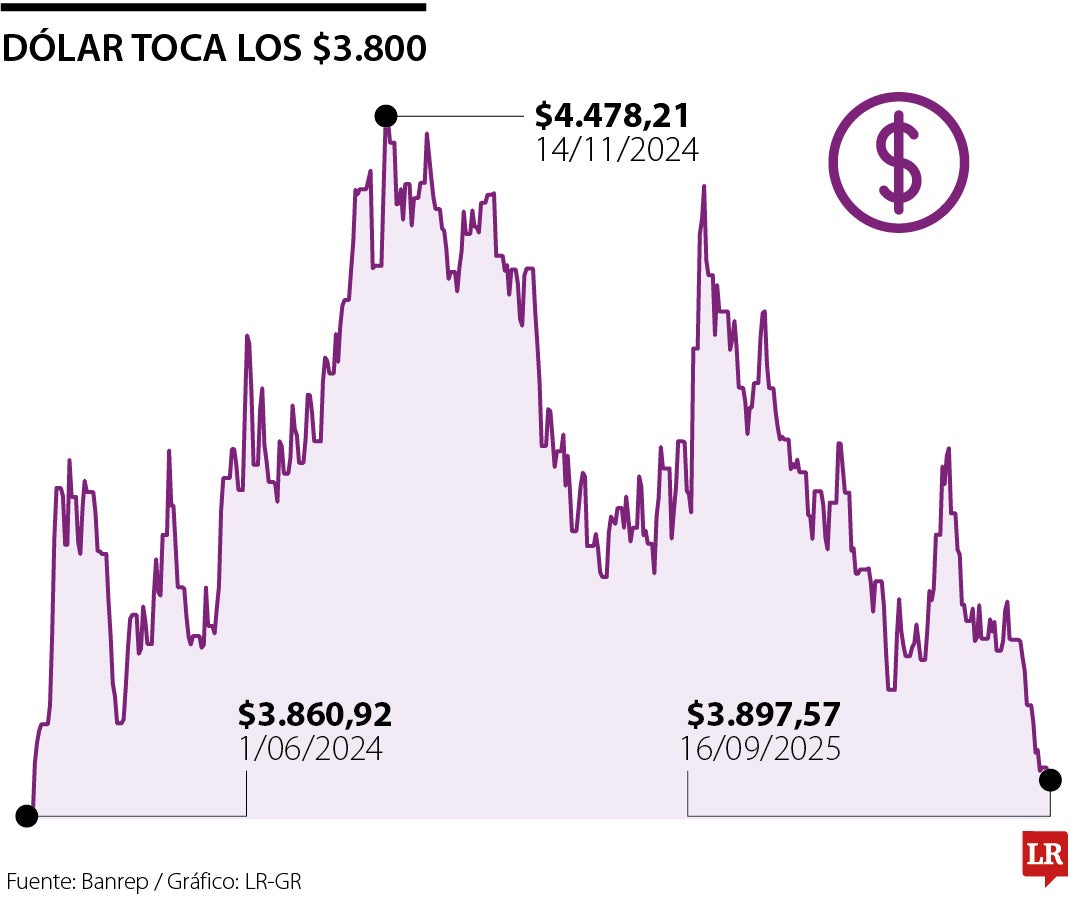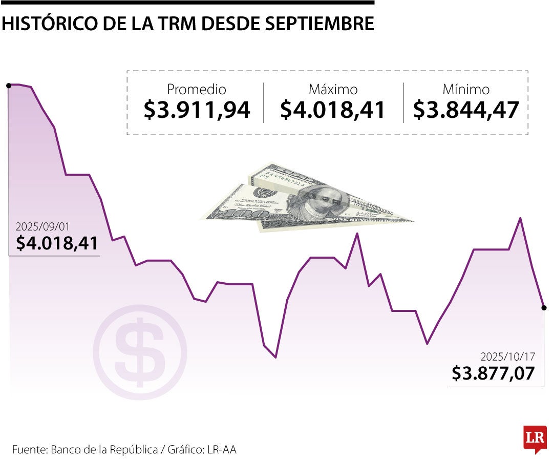 En Colombia, el dólar cerró la jornada a la baja en $3.808,6, lo que representó un descenso de $69 frente a la Tasa Representativa del Mercado, TRM, certificada en $3.877,07