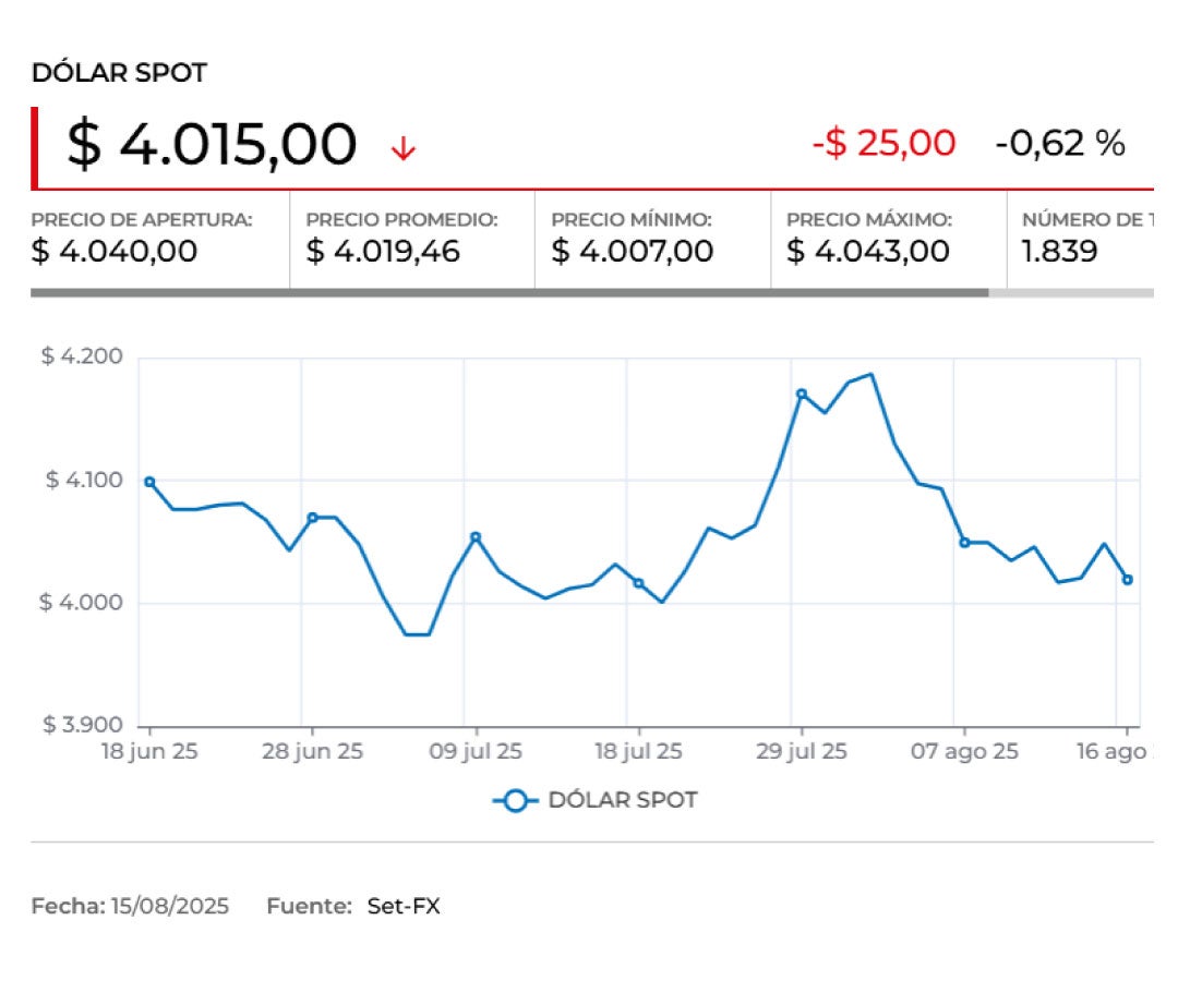 Además, la divisa registró un precio mínimo de $3.885 y un máximo de $3.885, con 3 transacciones por un monto de US$750.000