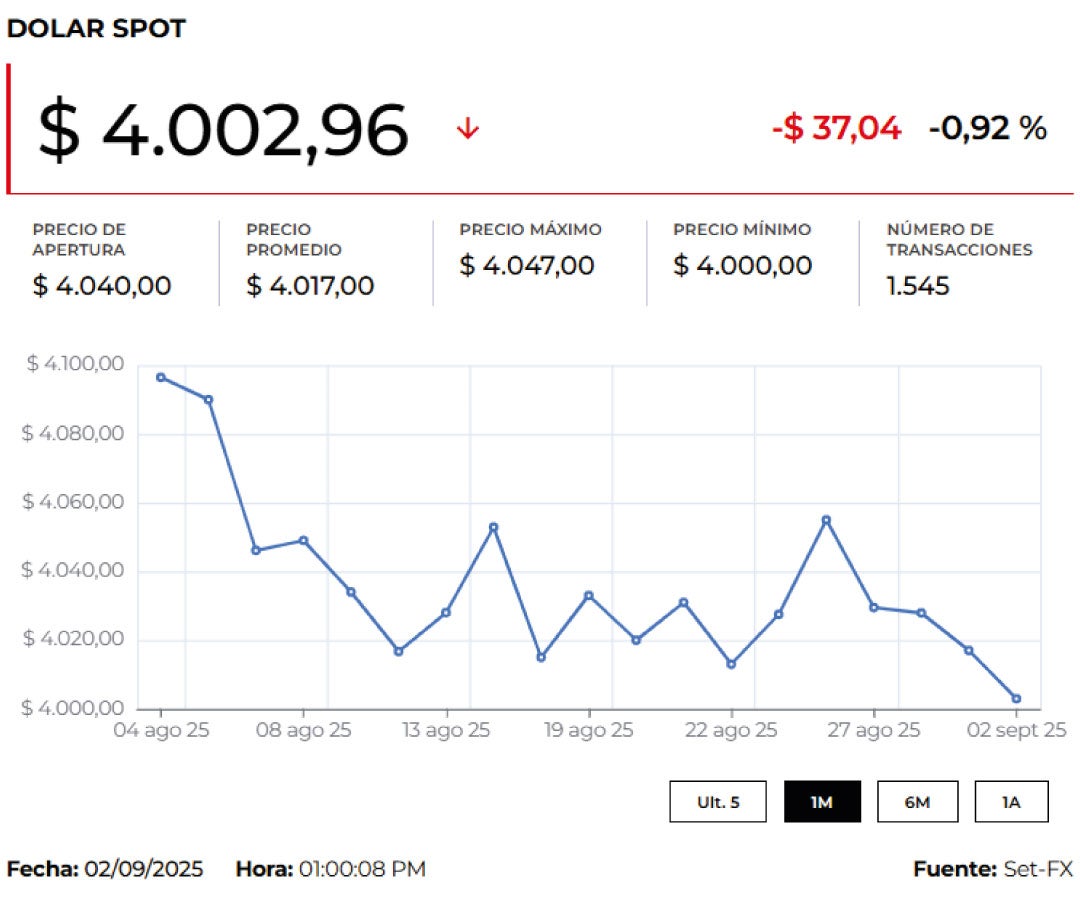 La divisa al cierre de la jornada registró un precio mínimo de $3.984 y un máximo de $4.011,9, con 1.666 operaciones por US$1.028 millones