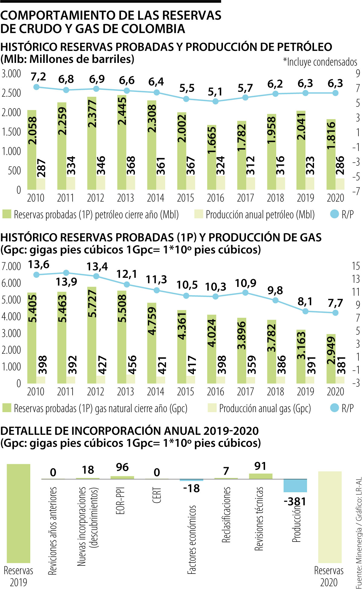 Con corte a 31 de diciembre, las reservas probadas de crudo alcanzaron 1.816 millones de barriles (Mbl), lo que significa una disminución de 11 % (225 Mbl), comparado con los resultados de 2019, cuando se reportaron 2.041 Mbl. De igual manera, en 2020, la producción disminuyó en 11,5%, pasando de 323 Mbl en 2019 a 286 Mbl en 2020. Mesa indicó que esto explica por qué los años de vida útil en crudo no disminuyeron.