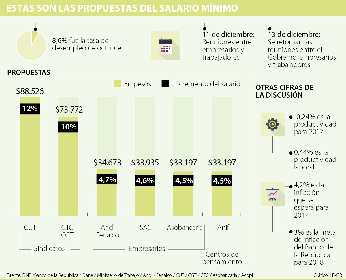 Las propuestas por el lado de las centrales obreras ya se conocían y tampoco se consolidaron en una sola. Por un lado, la Central Unitaria de Trabajadores (CUT) propuso un aumento del 12% ($88.526); mientras que la Confederación General del Trabajo (CGT) y la Central de Trabajadores de Colombia (CTC) sugiere un alza de 10%, es decir, $73.772.
