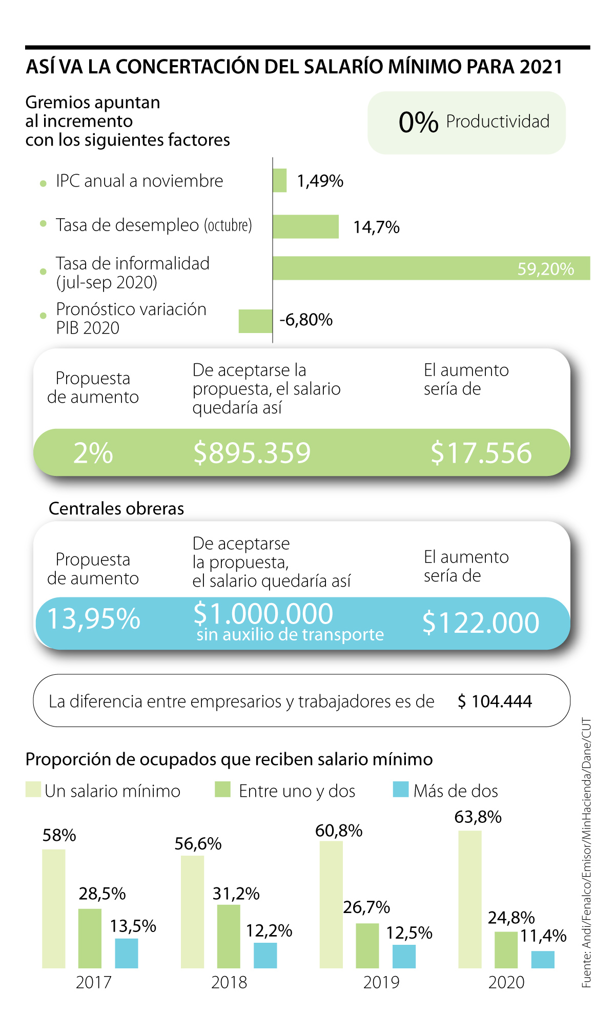 Cerca de dos semanas lleva la discusión para definir el aumento del salario mínimo que estará vigente en 2021. El debate que se viene dando entre sindicatos, empresarios y el Gobierno tuvo un nuevo giro, pues ayer se conoció que los representantes de los empresarios colombianos pusieron sobre la mesa una propuesta de aumento de 2%, es decir, un alza de $17.556.