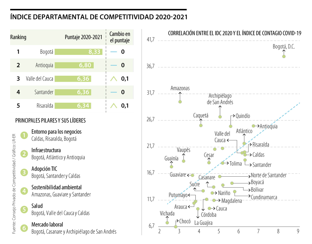 El Consejo Privado de Competitividad y la Universidad del Rosario presentaron ayer la octava edición del Índice Departamental de Competitividad (IDC) en la que se muestra que los departamentos que tienen un mejor puntaje reportan un ritmo de propagación más lento del covid-19, principalmente, debido a las iniciativas locales de pruebas y rastreo, así como a una mayor infraestructura hospitalaria.