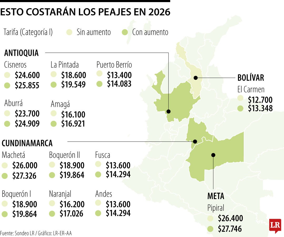 Con base en el alza del IPC, que en 2025 cerró en 5,1%, los peajes que quedaron con los precios más altos en la Categoría I (Automóviles, camperos, camionetas y microbuses con ejes de llanta sencilla) fueron Pipiral, con una tarifa de $27.746; Machetá, con $27.326; y Antioquia, con $25.855, los cuales están ubicados en los departamentos de Meta, Cundinamarca y Antioquia, respectivamente.