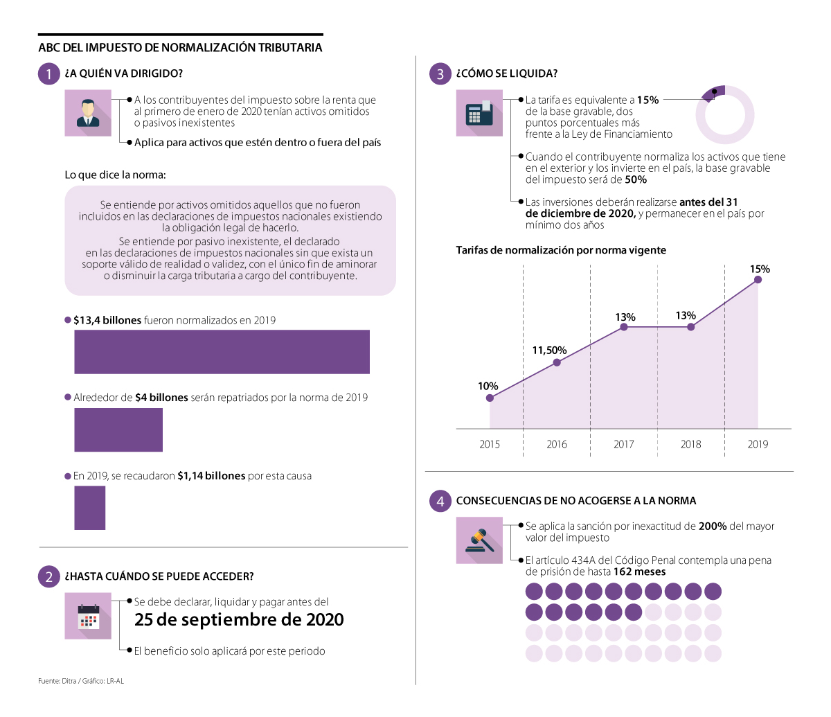 Esta norma va dirigida a los contribuyentes del impuesto sobre la renta que al 1 de enero de 2020 tenían activos omitidos o pasivos inexistentes, dentro o fuera del país. De modo que se les da una segunda oportunidad para declararlos y pagar hasta, máximo, el 25 de septiembre próximo, cancelando una tarifa de 15% sobre la base gravable del activo.
