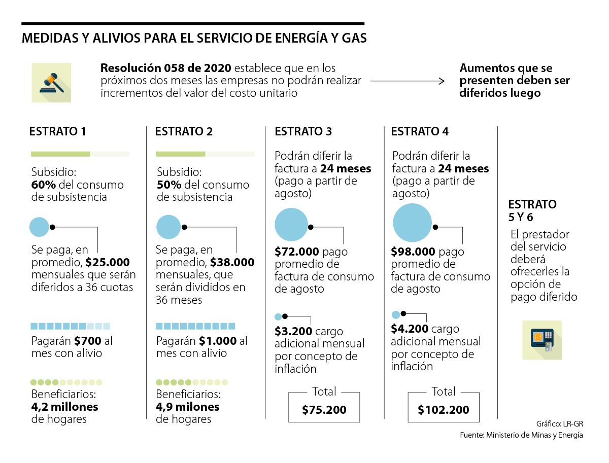 En concreto, la cartera minero-energética, de la mano de la Creg y la Superintendencia de Servicios Públicos anunciaron que estos beneficios irán para todo tipo de bolsillos. Los usuarios del estrato 1, por ejemplo, podrán diferir las facturas a 36 cuotas. Usualmente pagan $25.000 en promedio por la tarifa, por lo que a partir de agosto podrán dividir este pago. Así, tendrían que responder por $700 adicionales cada mes.