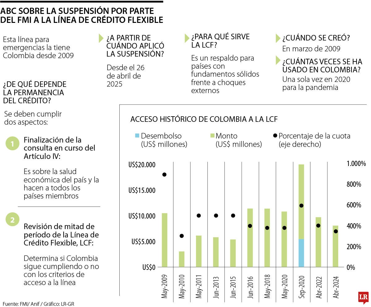 “A partir del 26 de abril de 2025, la calificación continua de Colombia para la Línea de Crédito Flexible, LCF, del FMI está supeditada a la finalización de la consulta en curso del Artículo IV y a una posterior revisión de mitad de período de la LCF. El acuerdo de la FCL se aprobó el 26 de abril de 2024 por un período de dos años con una revisión intermedia para evaluar la calificación continua”, explicó el FMI en un comunicado.