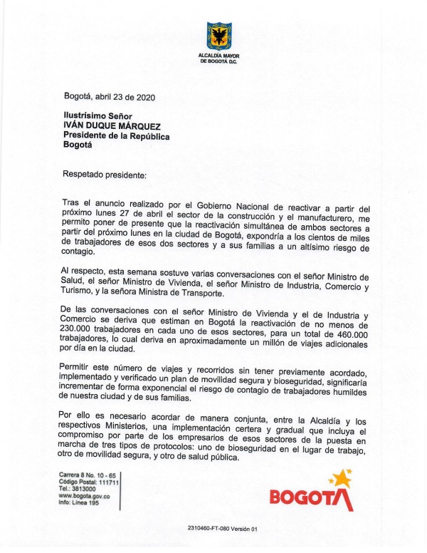 Por medio de una carta, la alcaldesa de Bogotá, Claudia López, solicitó al presidente de la República, Iván Duque, que la reapertura del sector de la construcción y la manufactura, que se dejó en firme en el Decreto de extensión de la cuarentena, no se haga de manera simultánea sino gradual, esto según la mandataria "para evitar el riesgo de contagio masivo de los trabajadores, de sus familias y la ciudad en general".