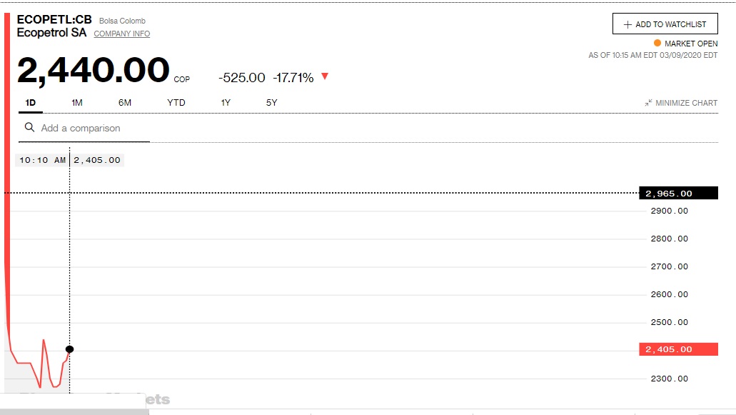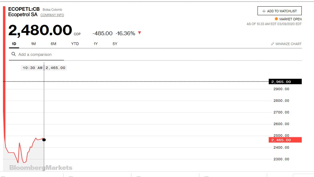En las primeras negociaciones de este lunes, y tras la fuerte caída de las bolsas a nivel mundial y el precio del petróleo, la acción de Ecopetrol cae hasta 20% a esta hora y se ubica en los $2.400.