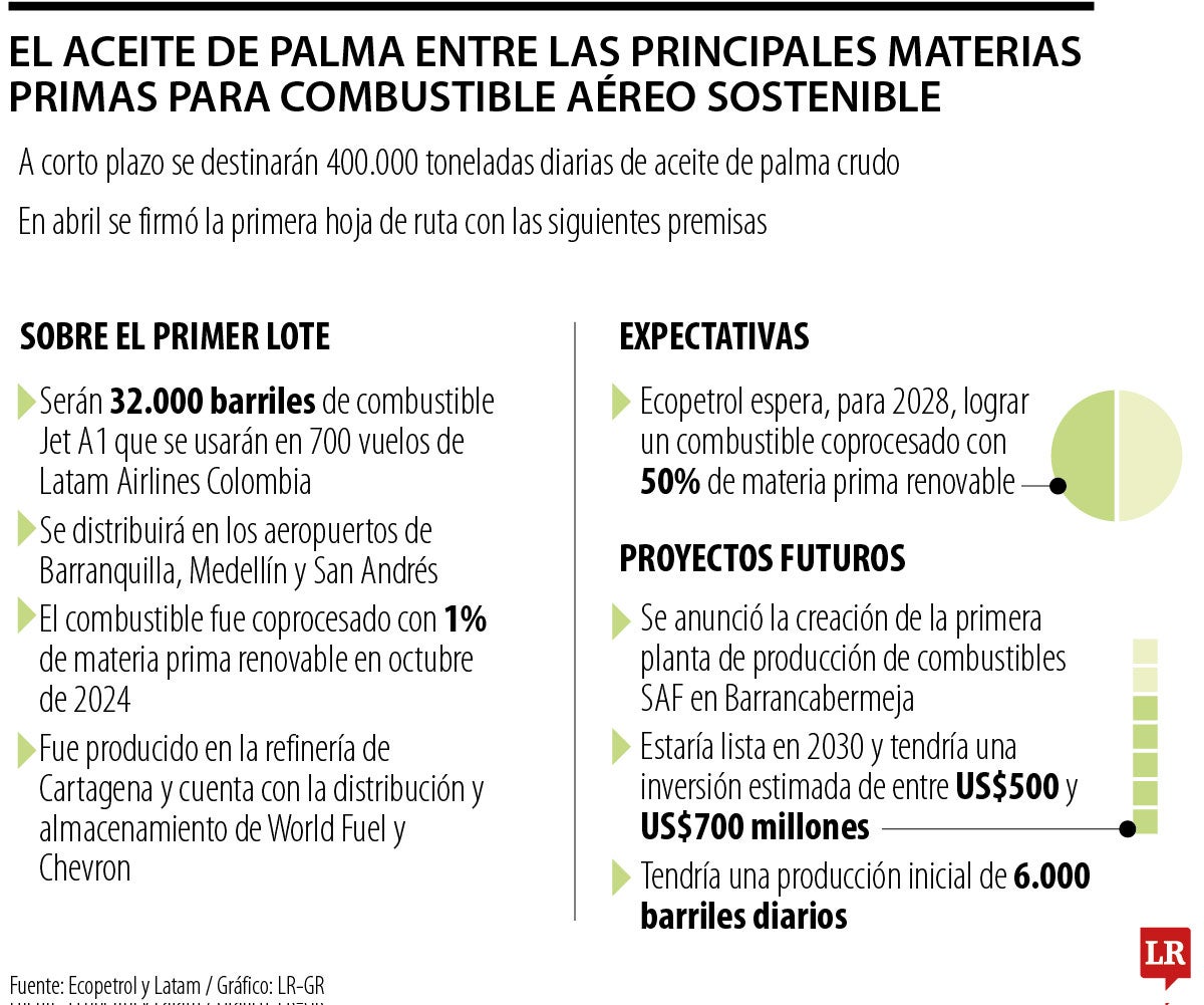 Sobre la materia prima que se requiere para este tipo de combustibles sostenibles, dijo que en este momento la materia prima disponible en Colombia que con la tecnología que en la actualidad es viable para producir SAF, es el aceite de palma. “Tanto Ecopetrol como los otros actores están esperando que la Organización de Aviación Civil Internacional, Oaci, admita el aceite de palma colombiano como materia prima para la producción de ese SAF. A partir de ahí se daría el detonante para las inversiones que se requieren para producir esto de forma comercial”, dijo el presidente de Fedepalma.