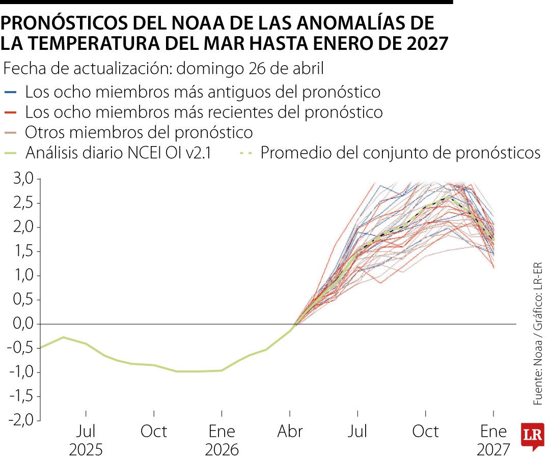 Al cotejar los ocho valores más recientes (del 16 al 25 de abril) con los ocho más antiguos de ese mismo periodo y el promedio de todas las estimaciones, se encontró que El Niño del segundo semestre se desarrollará con más fuerza, alcanzando alrededor de +2,5°C hacia finales de año. Incluso, algunas corridas individuales prevén hasta +3°C.