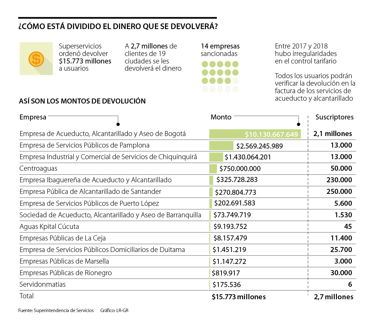 Del total de $15.773 millones, la superintendencia informó que la Empresa de Acueducto, Alcantarillado y Aseo de Bogotá tendrá que pagar la mayor parte. La firma que presta servicios en Bogotá, Soacha y Gachancipá tendrá que devolver un poco más de $10.130 millones a cerca de 2,1 millones de usuarios.