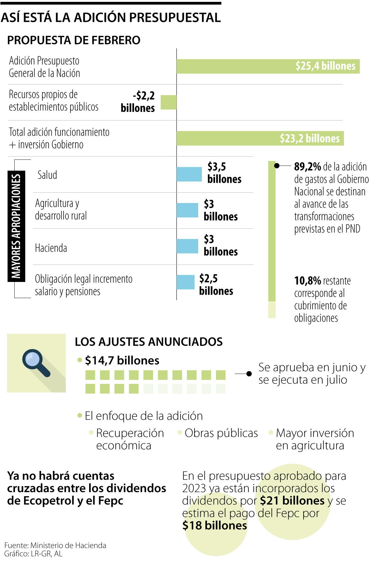 El ministro de Hacienda, Ricardo Bonilla, anunció que el monto de la adición presupuestal cambió. En febrero, la propuesta sumaba en total $25,4 billones, de los cuales $23,2 billones serían del Gobierno Nacional Central. Ahora, este monto tendrá un total de $14,7 billones, será probado en junio y empezará a regir en julio.