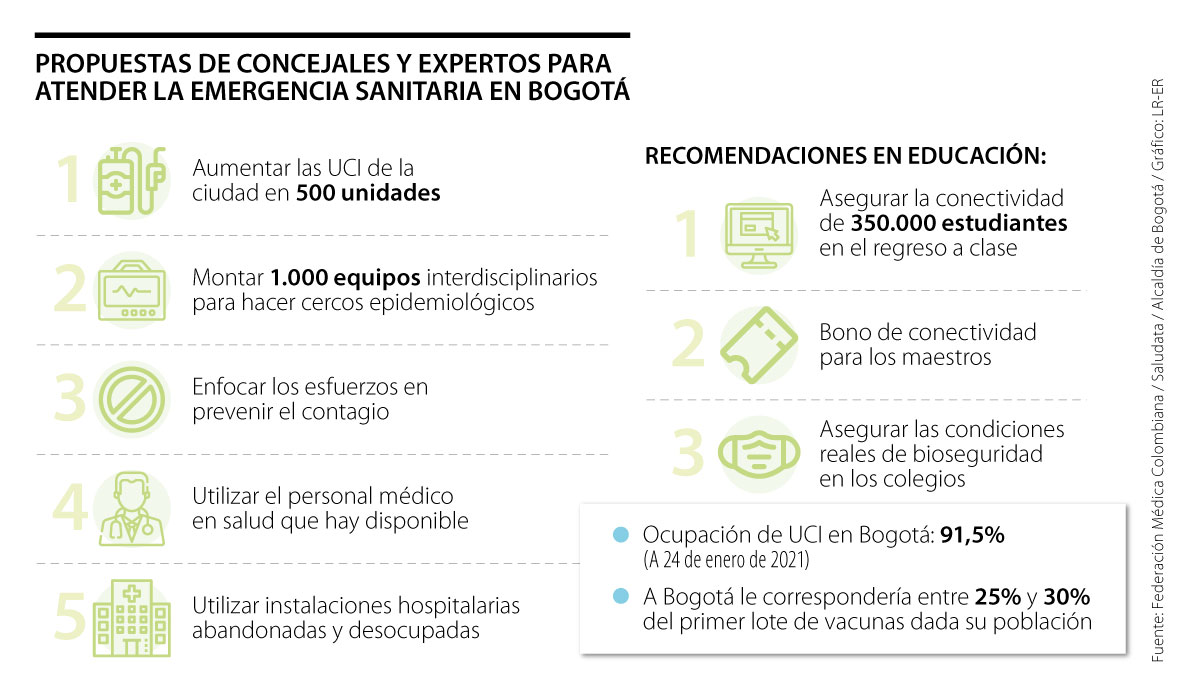 Así, una de las propuestas fue en enfocarse en prevenir el contagio, con el fin de evitar nuevas olas del virus y que el sistema hospitalario de la ciudad siga colapsando. Además, en esta misma línea, el exsecretario de Salud Román Vega propuso montar 1.000 equipos interdisciplinarios para que se hagan cercos epidemiológicos y, aunque también planteó aumentar el número de UCI de la ciudad en 500 unidades, los concejales insistieron en que un punto importante es prevenir el contagio.