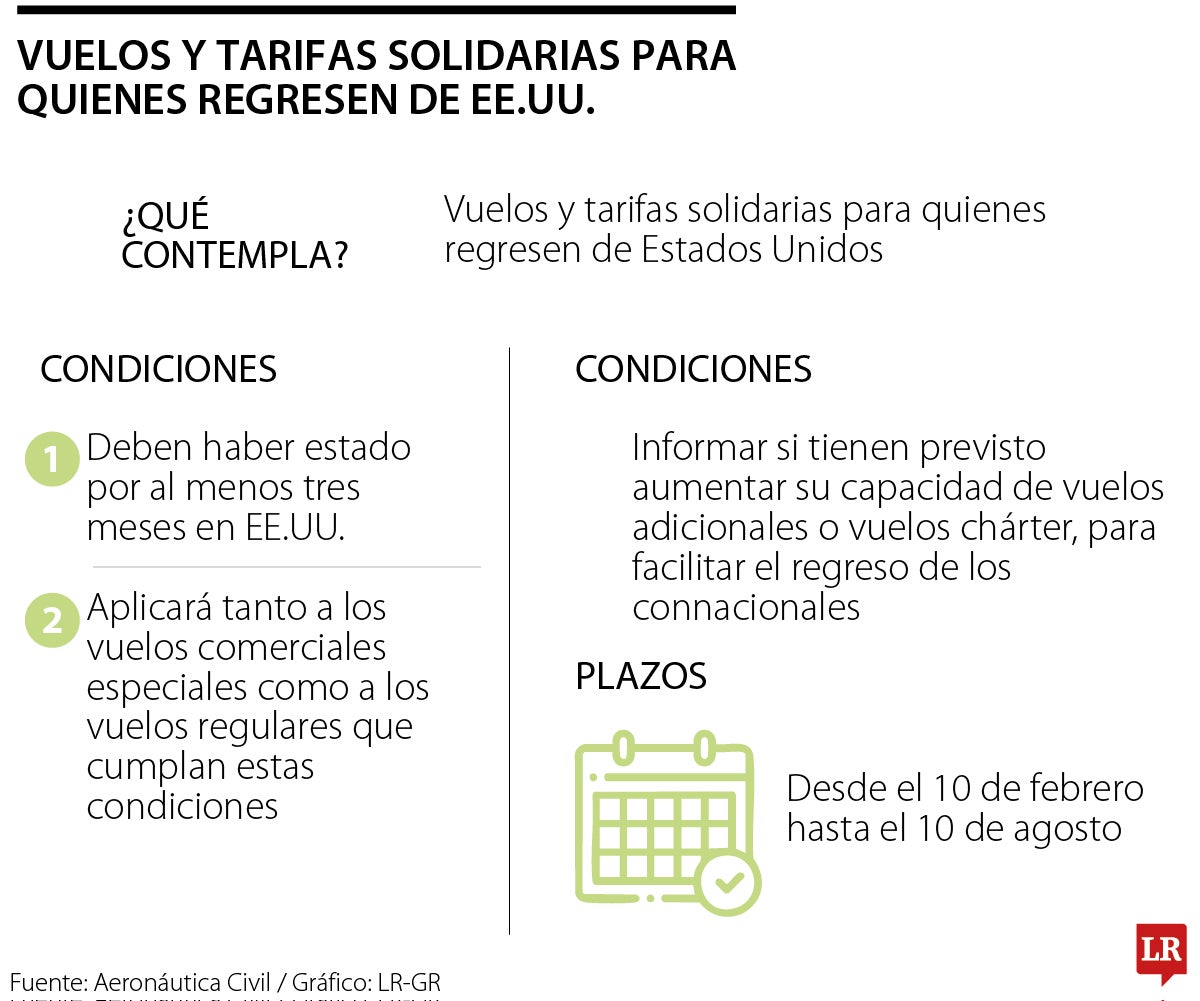 La Aeronáutica Civil ha instado a las aerolíneas a aplicar criterios de autorregulación, como los que se han aplicado anteriormente, estableciendo tarifas solidarias especiales para los ciudadanos colombianos que deseen regresar en un trayecto desde EE. UU. hacia Colombia, siempre que hayan permanecido en ese país por más de tres meses", señaló la entidad a través de un comunicado.
