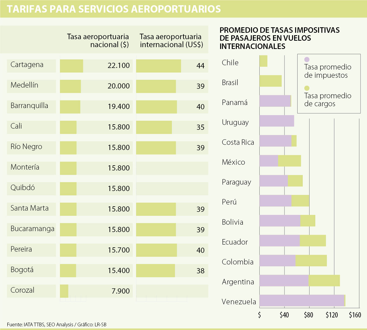 Según Iata, se demostró en Cartagena que reducir la carga impositiva en los tiquetes es beneficioso para la economía de la ciudad. De acuerdo con el gremio, la reducción de la tasa aeroportuaria de US$92 a US$38 generó un incremento de pasajeros internacionales de 26% a 38%, convirtiendo al aeropuerto de la ciudad en el de mayor crecimiento de Colombia. Por otro lado, según una empresa del sector, en vuelos internacionales los aeropuertos más costosos de operar en Suramérica son los de Argentina y Colombia, que estarían 13% por encima de los de menores costos como el de Lima.