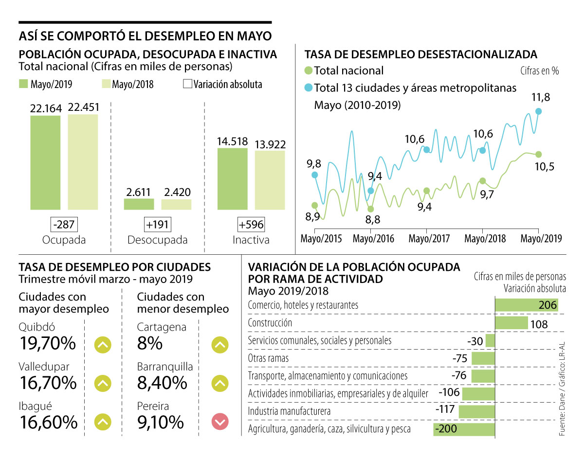 El deterioro del mercado laboral se evidenció de nuevo en mayo puesto que el Departamento Administrativo Nacional de Estadística (Dane) reveló que la tasa de desempleo se ubicó en 10,5%, lo que representó un aumento de 0,8 puntos porcentuales frente al mismo periodo del año anterior. De este modo, ya son diez los meses consecutivos en los que aumenta la población que quiere trabajar pero no encuentra empleo.