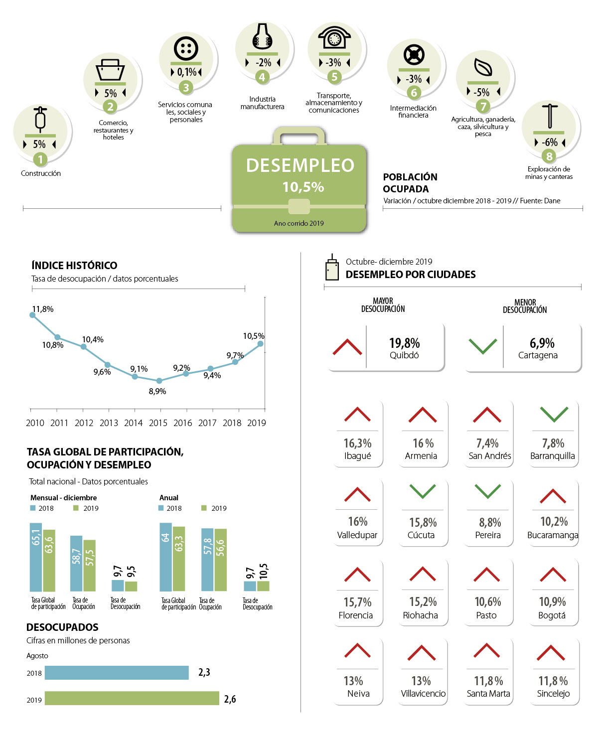 El año pasado la tasa de desempleo fue de 10,5 %, lo que se traduce en 2,6 millones de desocupados. El dane informó que en diciembre hubo una leve recuperación
