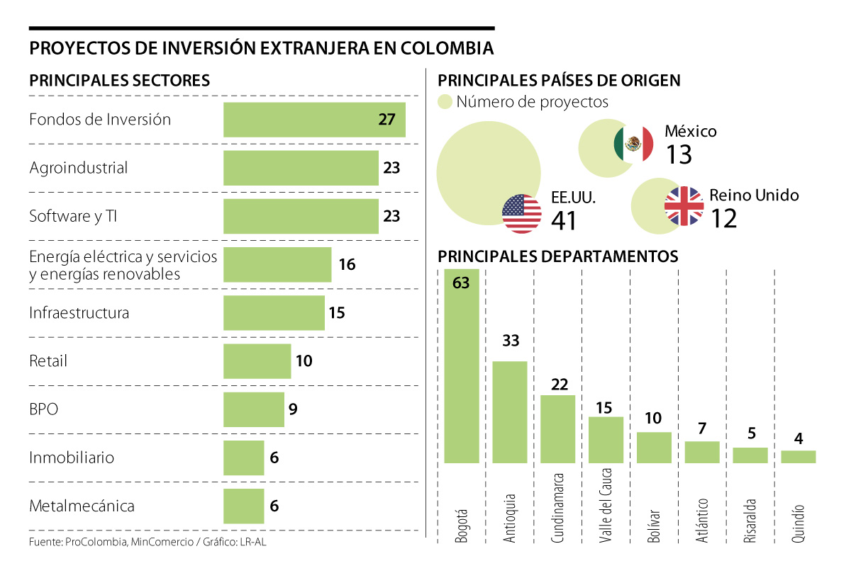 De acuerdo con el Ministerio de Comercio, Industria y Turismo y ProColombia, el país del cual proviene la mayoría de estos proyectos es EE.UU., de donde se originan 41 inversiones por un total de US$710 millones. De ellas, 11 se dieron en Antioquia, seis en Bogotá y cinco en Bolívar y el Valle del Cauca respectivamente.