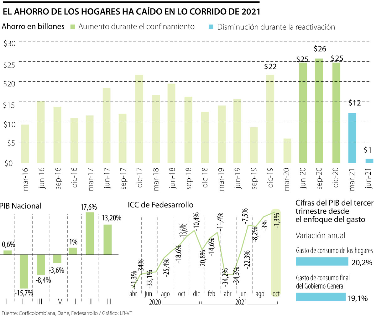 Uno de ellos es el ahorro de los hogares que, según cálculos de Corficolombiana, se redujo desde $25 billones al cierre del primer semestre de 2020, a $1 billón en el mismo periodo de 2021, es decir, se registró una caída de 96% anual.