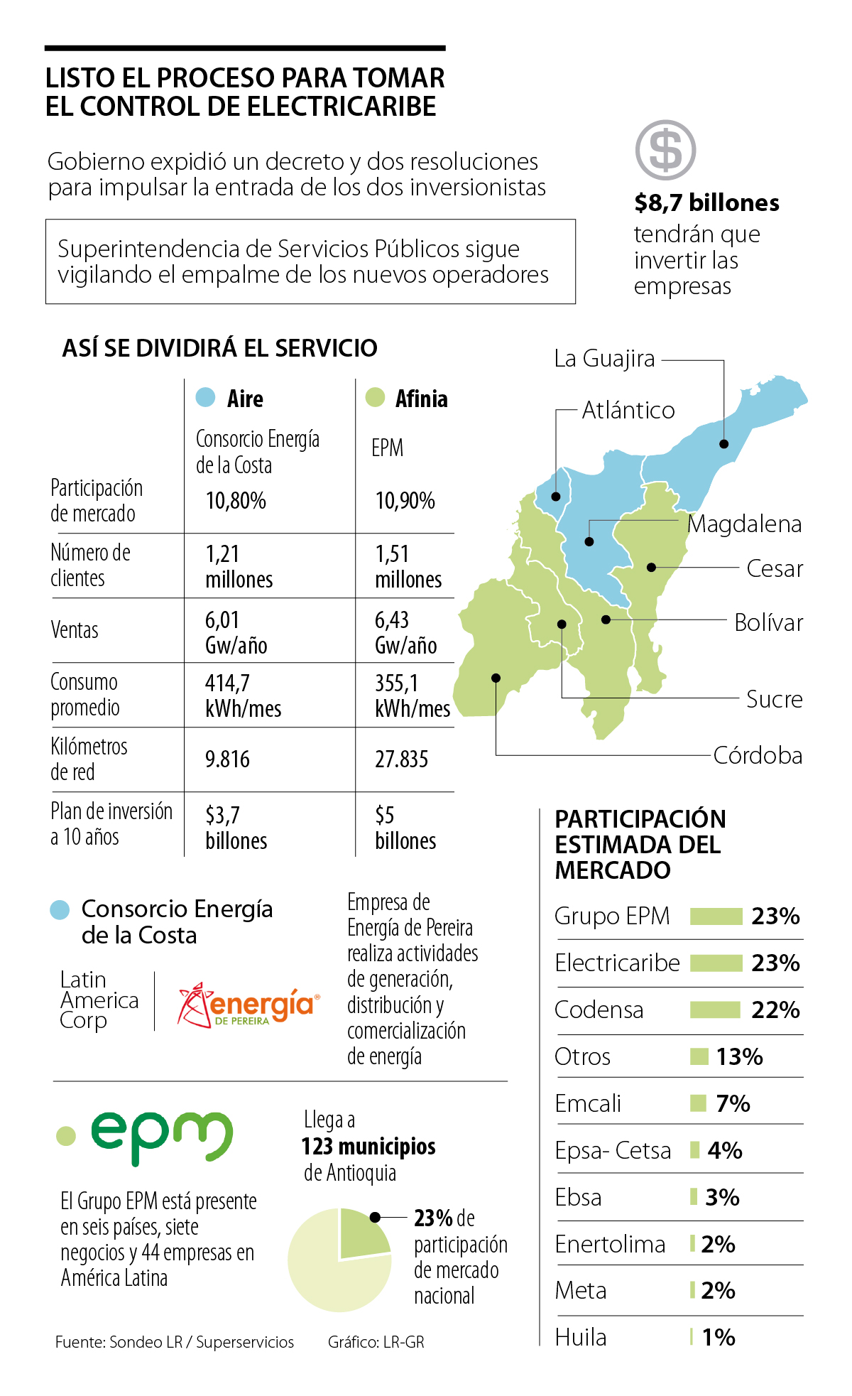 Bajo este panorama, EPM, con la nueva empresa Afinia, le prestará el servicio de energía a Caribe Mar, que cubre a 1,51 millones de clientes en los departamentos de Bolívar, Sucre, Córdoba y Cesar. Así mismo, el Consorcio Energía de la Costa , con su firma Aire, tendrá la operación de Caribe Sol, con 1,21 millones de clientes en los departamentos de Atlántico, Magdalena y la Guajira.