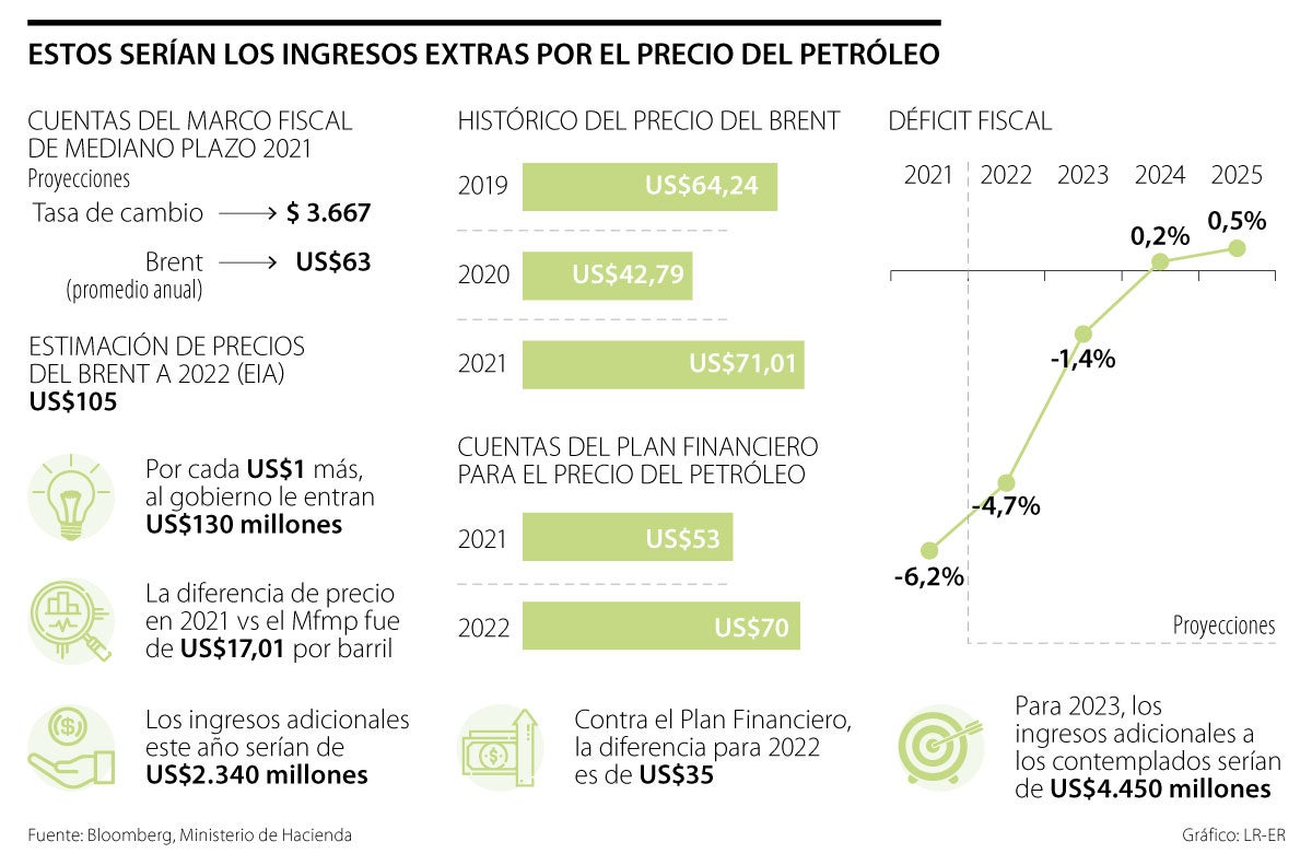 Ya desde el año pasado el precio del barril venía superando el estimado tanto en el Plan Financiero como el Marco Fiscal de Mediano Plazo. Para 2021, el Plan Financiero contemplaba un Brent a US$53 y el promedio de negociación, de acuerdo con Bloomberg, fue de US$71,01. Es decir que estuvo US$18 por encima. Según los cálculos del gobierno, cada US$1 adicional corresponde a US$130 millones más a lo estimado, es decir, podría significar US$2.340 millones adicionales.