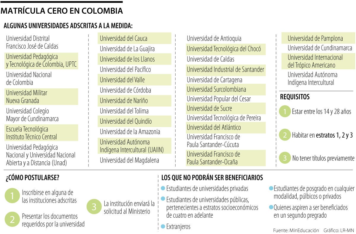 Para realizar el proceso de solicitud de la Matrícula Cero, el estudiante deberá inscribirse en una de las 64 instituciones de educación superior autorizadas por el Gobierno Nacional. Allí presentará los documentos requeridos por la universidad y serán las mismas instituciones quienes se encargarán de autorizar la gratuidad del semestre enviando la instancia a la cartera de educación nacional.