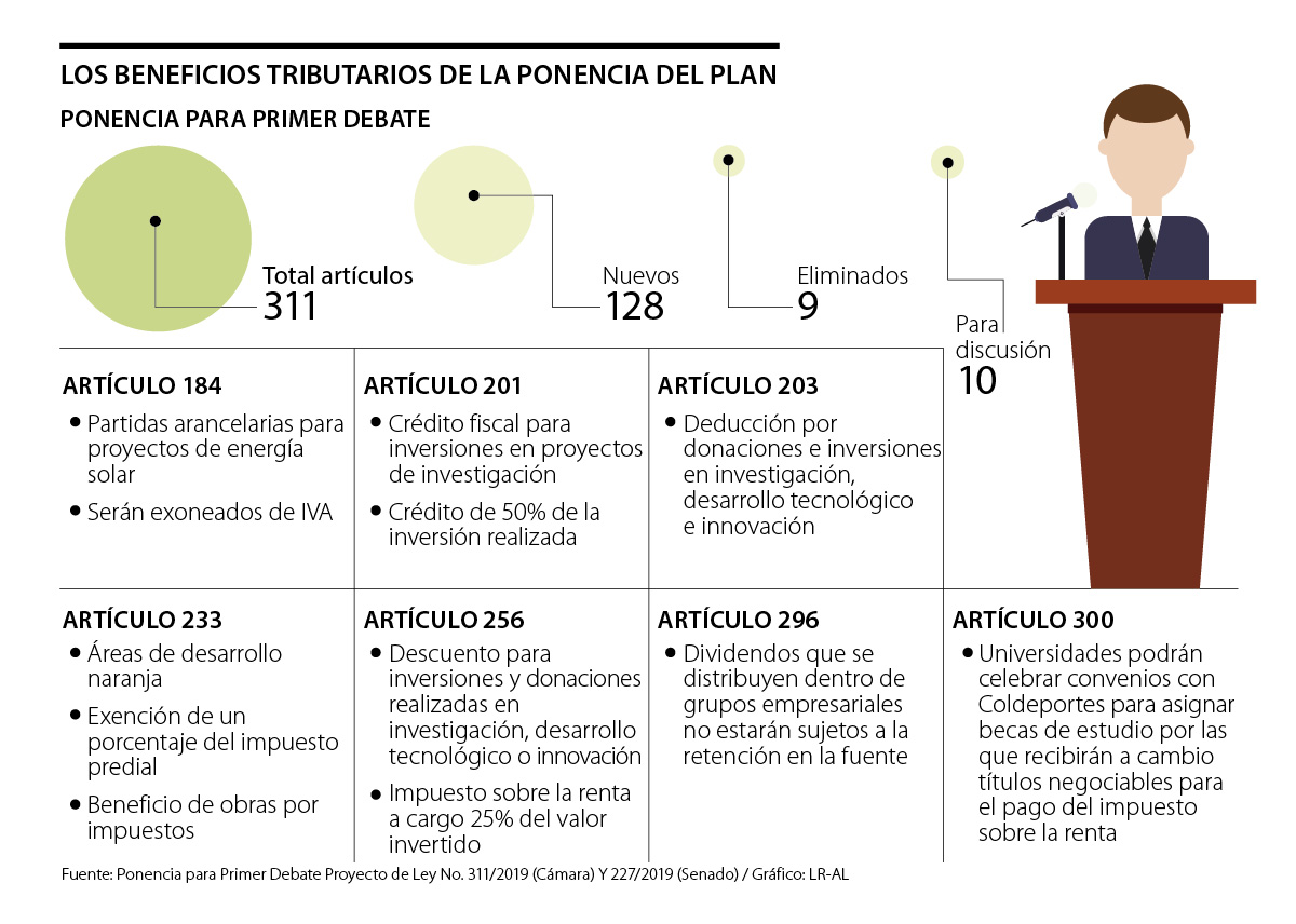 Por ejemplo, entre los artículos que identificó LR está el 184 que busca que todos los proyectos de generación de energía con paneles fotovoltaicos sean exonerados del pago del IVA de forma directa o el 201 que propone que las inversiones que realicen las micro, pequeñas y medianas empresas en los proyectos calificados como de investigación, desarrollo tecnológico e innovación podrán acceder a un crédito fiscal por valor de 50% de la inversión realizada.