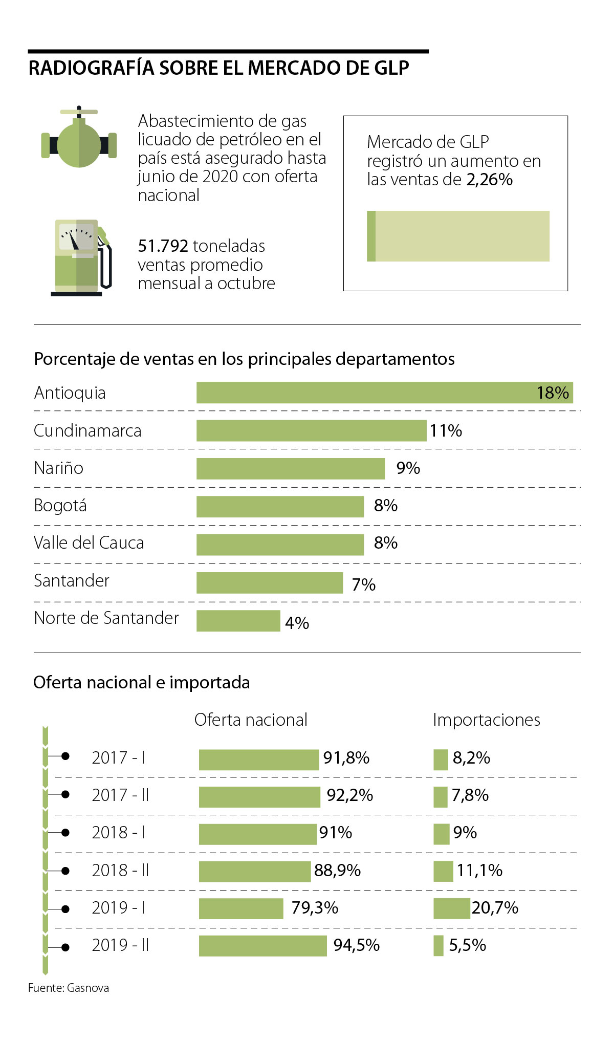 Así lo advirtió el presidente de la Asociación Colombiana del GLP (Gasnova), Alejandro Villegas, quien confirmó que “hasta el primer semestre del próximo año se tendrá una sobreoferta de GLP en el país. “Con esa sobreoferta, estamos teniendo GLP para mantener la autosuficiencia por ahí hasta junio de 2020”, dijo.